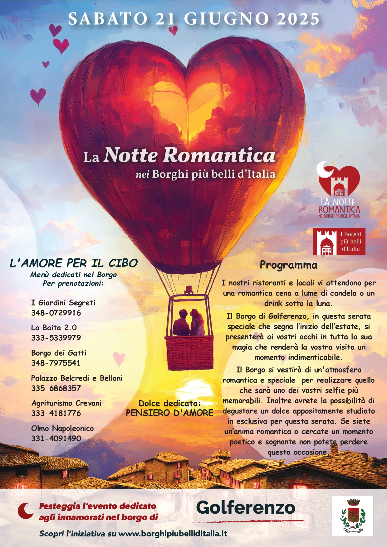 Il Borgo di Golferenzo, in questa serata speciale che segna l‛inizio dell‛estate, si presenterà ai vostri occhi in tutta la sua magia che renderà la vostra visita un momento indimenticabile.